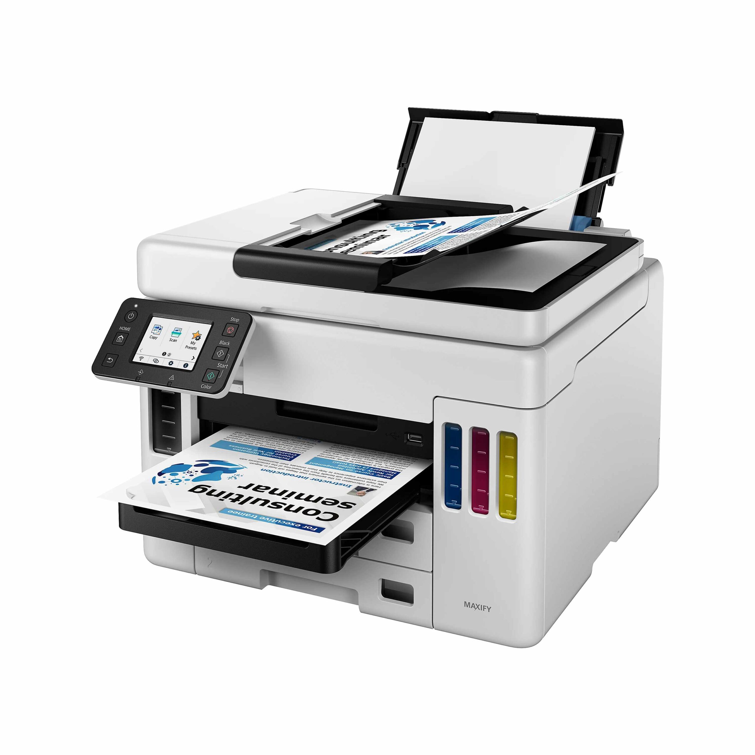 Ensure your office has access to reliable, high-quality printing with the refurbished MAXIFY GX7021 Wireless MegaTank All-In-One Printer. Featuring three paper trays with a combined capacity of 600 sheets, this printer is designed to handle large jobs without frequent tray refills. The all-in-one ink tank system, compatible with various mobile apps, allows you to conveniently print documents directly from your smartphone or tablet. The refurbished MegaTank printer utilizes pigment-based ink from keyed ink bottles to deliver crisp text and vibrant colors.